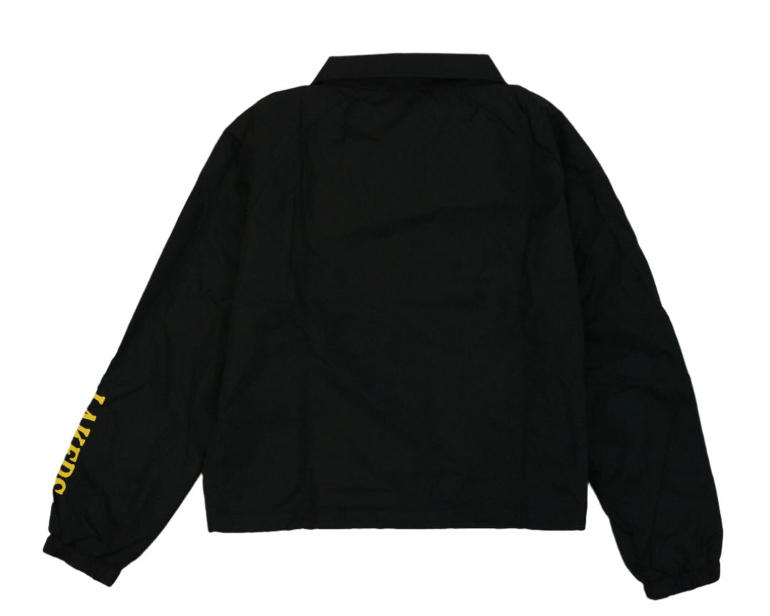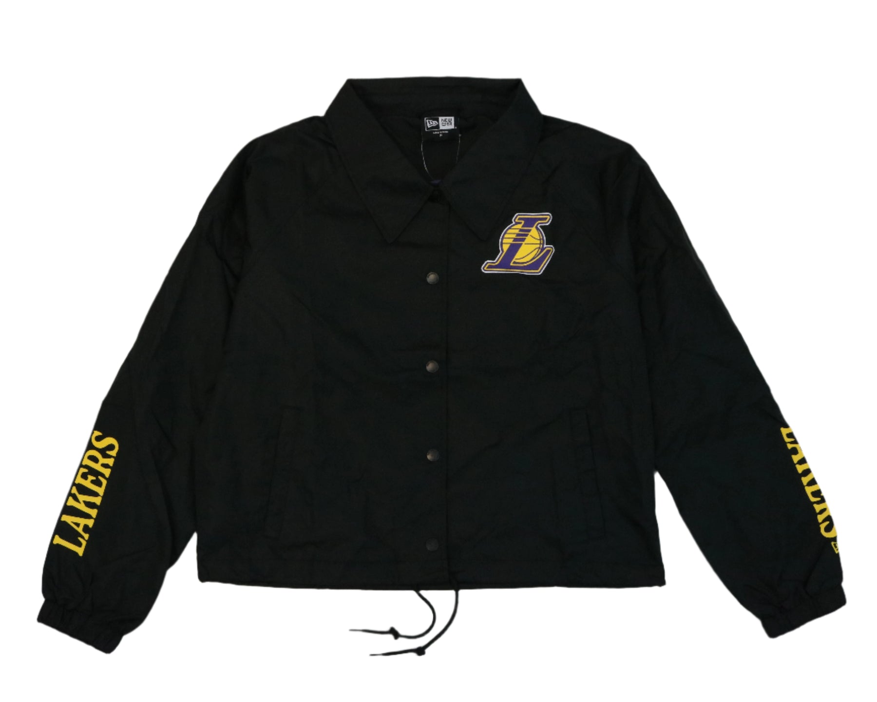Elevate your game day style with the Lakers Women's Button Up Coaches Crop Jacket from New Era. Made with black fabric and a button up design, this jacket offers a chic and comfortable fit. Perfect for showing your team spirit while staying trendy.